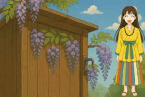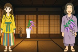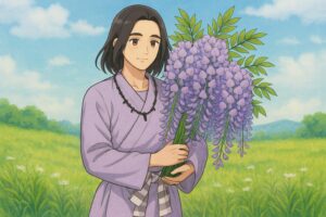 霞壮夫がそれらを身にまとい、袁登売の家を訪ねると、衣も弓矢もすべて美しい藤の花に変わり、艶やかに咲き誇りました。