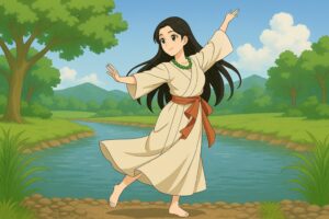 天皇吉野の宮にいでましし時、吉野川の邊に、童女あり、それ形姿美麗かりき。かれこの童女を召して、宮に還りましき。後に更に吉野にいでましし時に、その童女の遇ひし所に留まりまして、其處に大御呉床を立てて、その御呉床にましまして、御琴を彈かして、その童女に儛はしめたまひき。ここにその童女の好く儛へるに因りて、御歌よみしたまひき。その御歌、