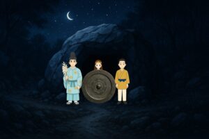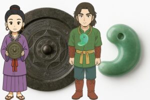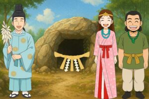 石凝姥命(いしこりどめのみこと)には八咫鏡(やたのかがみ)を作らせ、玉祖命(たまのおやのみこと)には八尺瓊勾玉(やさかにのまがたま)を連ねた玉飾りを作らせました。