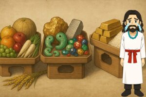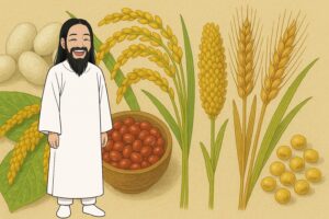 すると、大気都比売神の亡骸から不思議なものが次々と生まれました。頭からは蚕、両目からは稲、耳からは粟、鼻からは小豆、股からは麦、尻からは豆が出てきました。
