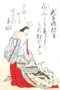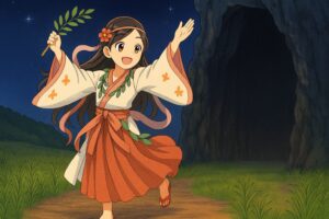 天宇受売命(あめのうずめのみこと)は、天香具山の日陰蔓(ひかげのかずら)をたすきにかけ、真拆葛(まさきのかずら)を髪飾りにし、手には笹の葉を束ねて持ち、岩戸の前に置いた伏せ桶の上に立ちました。これは神懸かりになるために準備です。