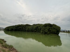 河内の恵賀の長江は、藤井寺市藤井寺の「岡ミサンザイ古墳」に治定されています。全長245メートルの前方後円墳。「ミサンザイ」は「ミササギ(陵)」の転訛です。