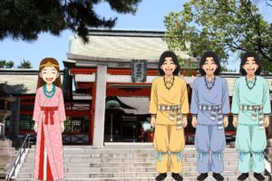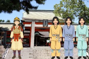 大阪の住吉大社は、このとき神功皇后に神託を降ろし、新羅遠征を助けたとされる、底筒男命、中筒男命、上筒男命、そして神功皇后を御祭神とし、今もその御神徳を伝えています。