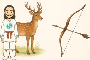 こうして天若日子には、鹿の霊威が付いている立派な羽の付いた弓矢が授けられ、葦原中国へ遣わされました。