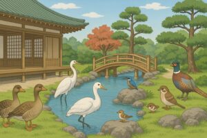 雁は供物を運ぶ役、鷺は穢れを祓う掃除役、カワセミは料理役、雀は米を搗く役、雉は泣き女の役とされ、八日八夜にわたって楽器を鳴らして、天若日子の魂を慰め、嘆き悲しみました。