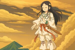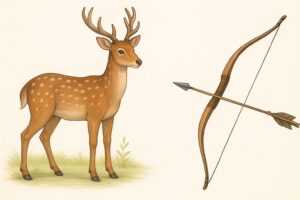 こうして天若日子には、鹿の霊威が付いている立派な羽が付いた弓矢が授けられ、葦原中国へ遣わされました。