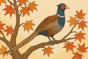 そこで雉は下界に降り、天若日子の屋敷の門の楓の木の上にとまって言いました。