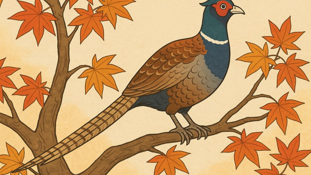 そこで雉は下界に降り、天若日子の屋敷の門の楓の木の上にとまって言いました。