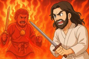 悲嘆に暮れた伊邪那岐命は、怒りを込めて天之尾羽張(あめのおはばり)という名の十拳剣(とつかのつるぎ)を抜き、火之迦具土神を一太刀に斬り伏せられました。
