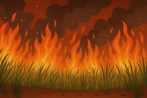 大国主命が草を分けて入っていくと、須佐之男命は野に火を放ち、四方を炎で囲ませました。
