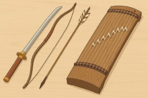 そして須佐之男命の生大刀(いくたち)・生弓矢(いくゆみや)・天の沼琴(あめのぬごと)を奪い、須勢理比売を背負って逃げ出しました。