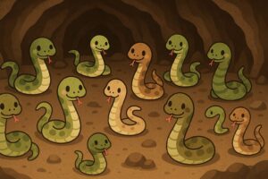 その晩、大国主命を蛇の室(むろ)に入れて寝させました。室の中には大蛇や小蛇がうようよと集まっていました。