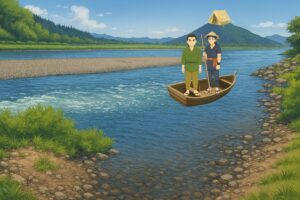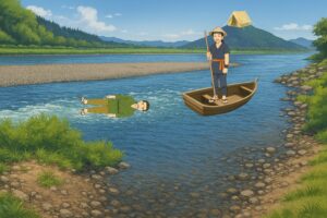 そう語るうち、船は川の中央に差しかかりました。ちょうどその時、船頭の和紀郎子は船を大きく傾け、大山守命を川へ突き落としました。
