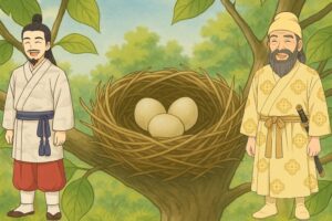 「これはきっと、あなた様がいずれ天下をお治めになる前兆です。その瑞兆として、雁が珍しく卵を産んだのでございましょう。」