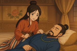 皇后はそのとき短刀を抜き、三度まで天皇の首に振り下ろそうとしましたが、夫を思う気持ちが勝り、殺めることができず、涙を流して手を止めました。