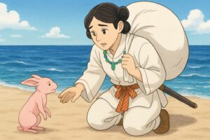 一行が因幡の気多の岬に着くと、そこには毛が抜け落ち、裸同然の兎が苦しげに地面に横たわっていました。