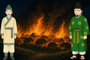 参照元:『御歴代百廿一天皇御尊影』「履中天皇」ところが、すぐ下の弟の墨江之中津王(すみのえのなかつのおう)が、兄を討って位を奪おうと考え、突如御殿に火を放ちました。兄弟の母親は、嫉妬に関する逸話が残る石之日売(いわのひめ)です。
