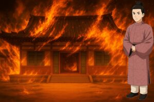 たちまち炎は四方へ燃え広がり、宮中は大混乱に陥りました。