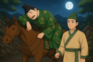 酔い潰れていた履中天皇を、渡来系の豪族である大和漢直(やまとのあやのあたい)の祖・阿知直(あちのあたい)が急いで抱え出し、馬にお乗せして大和へと逃れました。