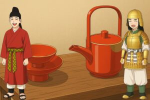 まず、水歯別命が先に飲み安心させた後、曽婆訶理に代わり、大きなお盃がその顏を覆いました。