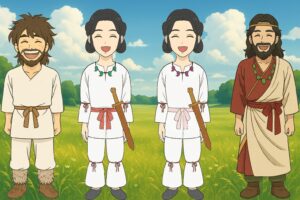 成長した鵜葺草葺不合命は叔母の玉依比売を妃とし、五瀬命(いつせのみこと)、稲飯命 (いないのみこと)、御毛沼命(みけぬのみこと)と、のちに神武天皇になる神倭伊波礼毘古命 (かむやまといわれびこのみこと)の四子をもうけました。