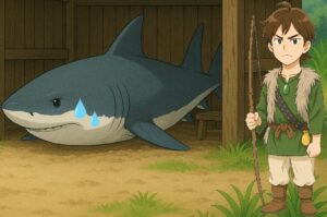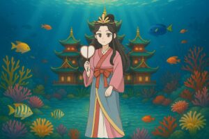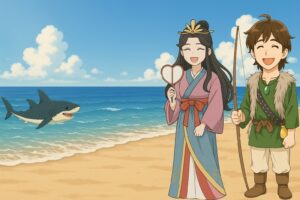 そこには、八尋(やひろ)もある大鮫となった豊玉比売が、うなりながら出産する姿がありました。