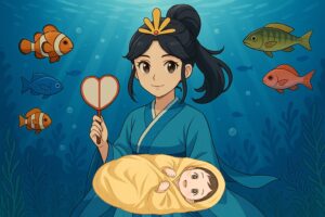 やがて臨月を迎え、「天の神の御子を海中で産むべきではない」と考え、海を越えて地上へとやって来ました。