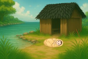やがて臨月を迎え、「天の神の御子を海中で産むべきではない」と考え、海を越えて地上へとやって来ました。