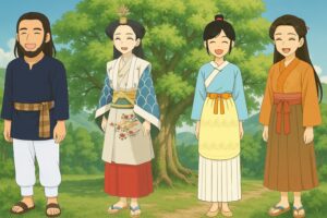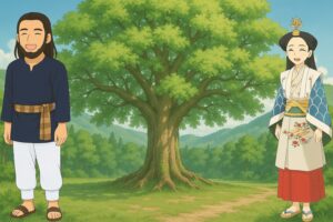 纏向の日代宮(ひしろのみや)は朝日も夕日も射し渡る、堅固な地に建つ檜の大宮殿。外には欅が繁り、その上の枝は天を覆い、中の枝は東国を覆い、下の枝は田舎の地を覆っています。それぞれの枝の葉は触れ合い、やがてその葉は、私、着物を三重に着ている、三重の伊勢から来た娘の捧げる盃に浮かびました。それは天地創成の折、大地が油のように漂っていたさまを思わせます。水音もコオロコオロと、誠にめでたいことでございます、尊い日の御子様」