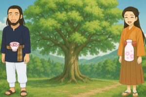 そこに伊勢出身の三重采女(みえのうねめ)という女官が、天皇にお酒を奉りました。すると、けやきの葉が一枚、盃に落ちましたが、采女はそれに気づかずそのまま注ぎ続けました。