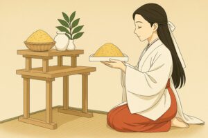 新嘗祭は、「新」は新穀(しんこく)を「嘗」はお召し上がりいただくことを意味し、収穫された新穀を神に奉るお祀りのことです。現在、11月23日に伊勢神宮をはじめ、全国の神社で行われています。