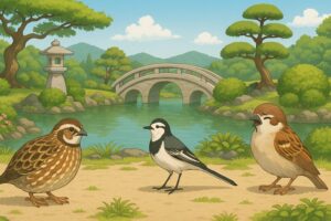 「宮廷に仕える人々は鶉(うずら)のように頭巾をつけ、鶺鴒(せきれい)のように尾を振り合い、雀のように群がって、今日もまた盛んに酒宴をしている。すばらしい宮廷の人たちは」