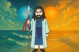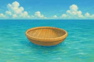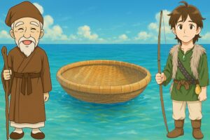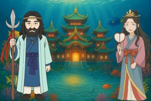 困り果てた火遠理命が海辺で泣いていると、潮の神・塩椎神(しおつちのかみ)が現れ、事情を聞いて哀れみ、「私が助けてあげましょう」と言って隙間のない籠の小船を作り、彼を乗せて海へ押し流してくれました。