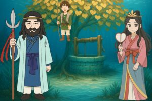 侍女が井戸を覗くと光が射したので、驚いて見上げてみると立派な男性が立っていました