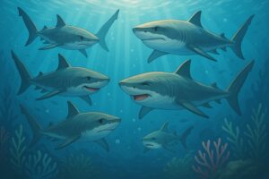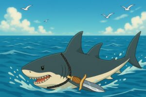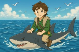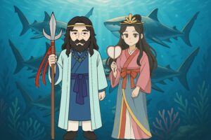 さらに鮫たちを呼び、「誰が天の御子を一番早く送れるか」と問うと、大鮫が「私なら一日で送れます」と答えました。綿津見神は、人が左右に手をひろげた大きさの一尋鮫に「決して命を怖がらせるな」と言って、命を任せました。