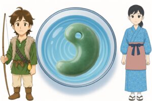 火遠理命が水を求めると、侍女は器に水を汲んで差し出しましたが、命は飲まずに首飾りの珠を口に含み、その器に吐き入れました。