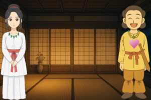 大久米命が「この中のどなたをお召しになりますか」と歌でおたずねすると、天皇はすぐに悟り、「一番前にいるあの娘を妻としよう」と歌でお答えになりました。