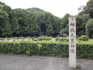 神武天皇の御陵は、畝傍山東北陵(うねびやまのうしとらのすみのみささぎ)。現在は、宮内庁により奈良県橿原市大久保町の「四条ミサンザイ」に治定されています。