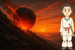 八十神たちは山の上で、大きな石を真っ赤に焼いて、猪に見立てて落としました。
