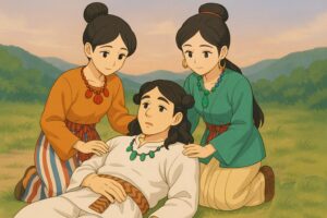 それを知った母の刺国若比売(さしくにわかひめ)は深く嘆き、天に昇って神産巣日命(かみむすびのみこと)に救いを求めました。