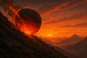 八十神たちは山の上で大きな石を猪に見立て、火で真っ赤に焼いて転がし落としました。