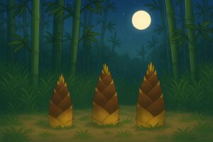 その隙に伊邪那岐命は逃げましたが、再び追いつかれます。今度は右の鬢の櫛の歯を投げると、そこから筍が生え、醜女たちはまた食べ始めました。